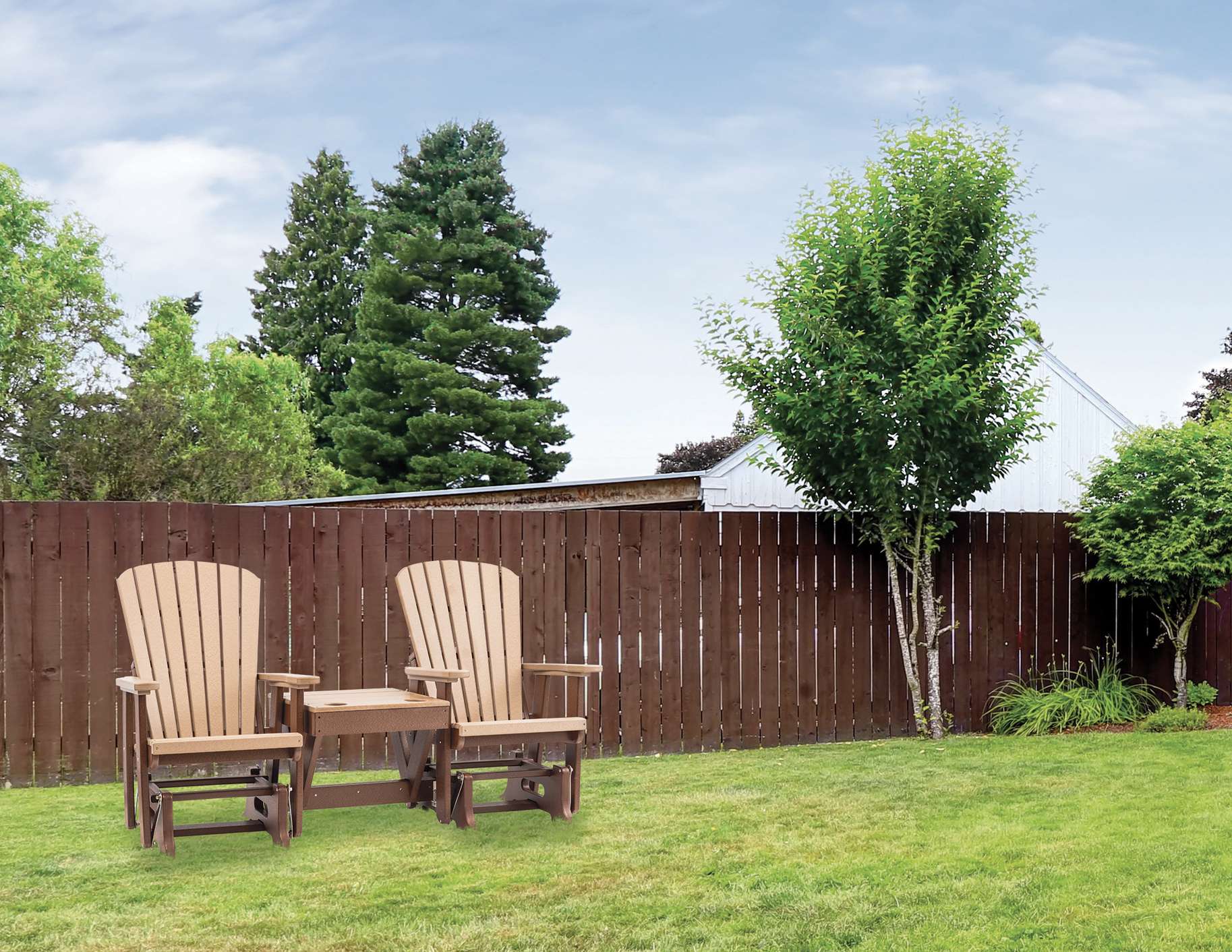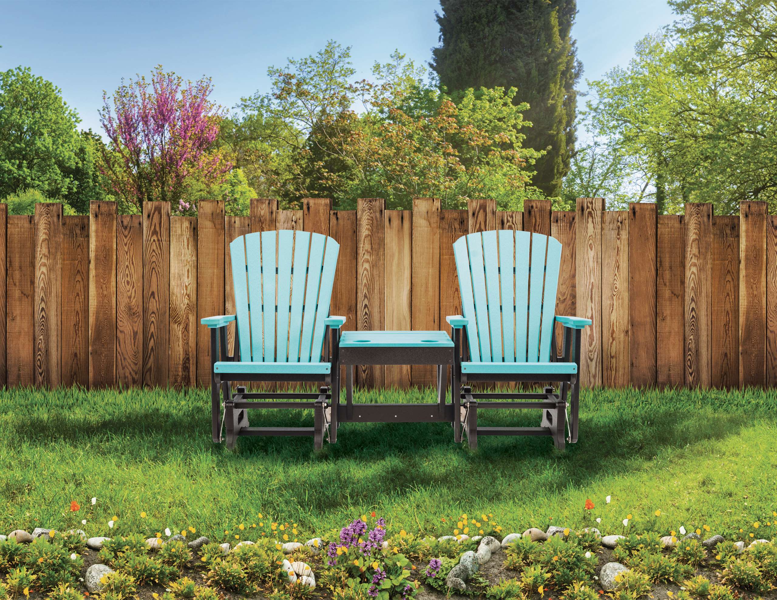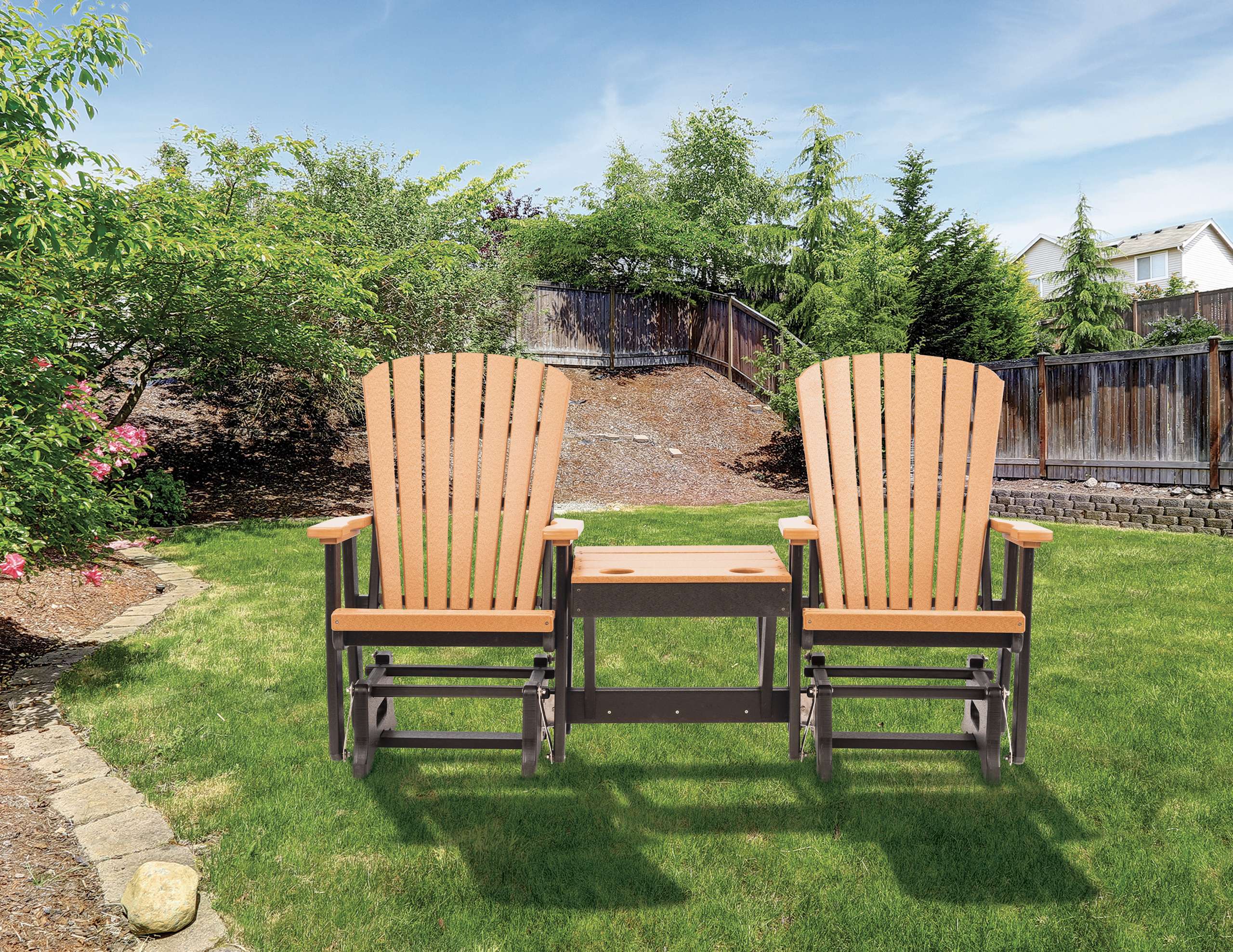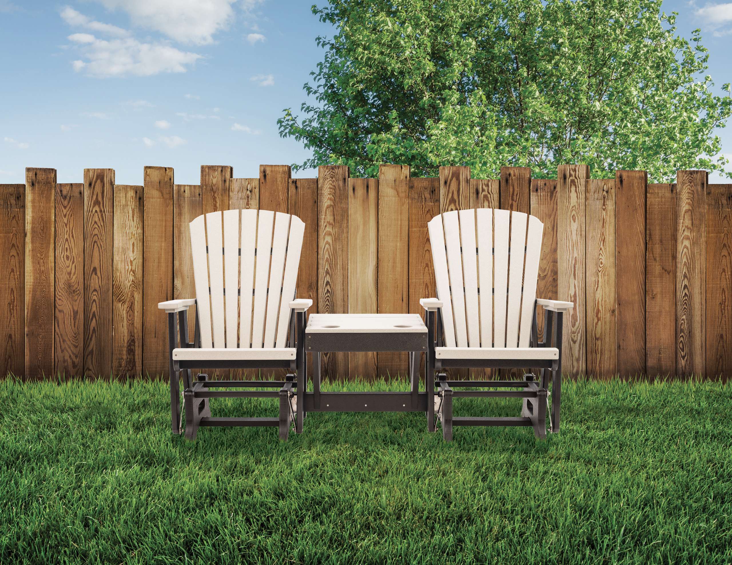 Don’t just sink into our stylish Adirondack chairs with your favorite drink, share the experience with someone else! Imagine how many hours of comfort you could enjoy in the coming years! With its attractive center table, drink holders at just the right height, and perfectly contoured chair backs, our Grand Lake Adirondack Double Glider, with its independently-operating chairs, provides the superior patio relaxation that you have been dreaming of!